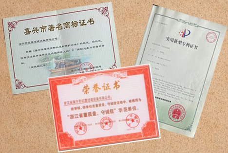 紅旗過(guò)濾全自動(dòng)過(guò)濾機(jī)專(zhuān)利證書(shū)和多項(xiàng)榮譽(yù)證書(shū)